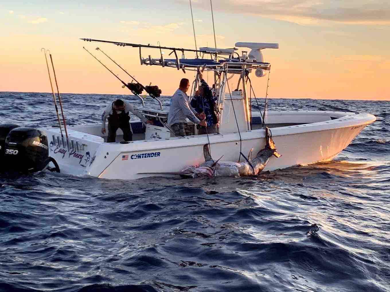 The Controlled Chaos is a 35 ft Contender center console that comfortably fits up to six guests. Fully rigged for tournament-level action, it features outriggers, downriggers, a large livewell, and top-tier electronics. Powered by twin 300 HP Suzuki engines, it reaches up to forty knots, getting you to prime fishing grounds fast, often within just a few miles of shore.