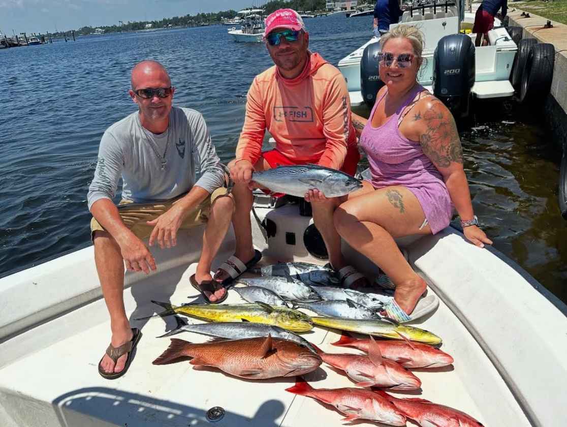 Target species may include Redfish, Cobia, Mahi Mahi, Kingfish, Amberjack, Sheepshead, Grouper, and more, depending on the season and conditions. Outriggers, downriggers, and all necessary fishing gear are provided, with live bait available.