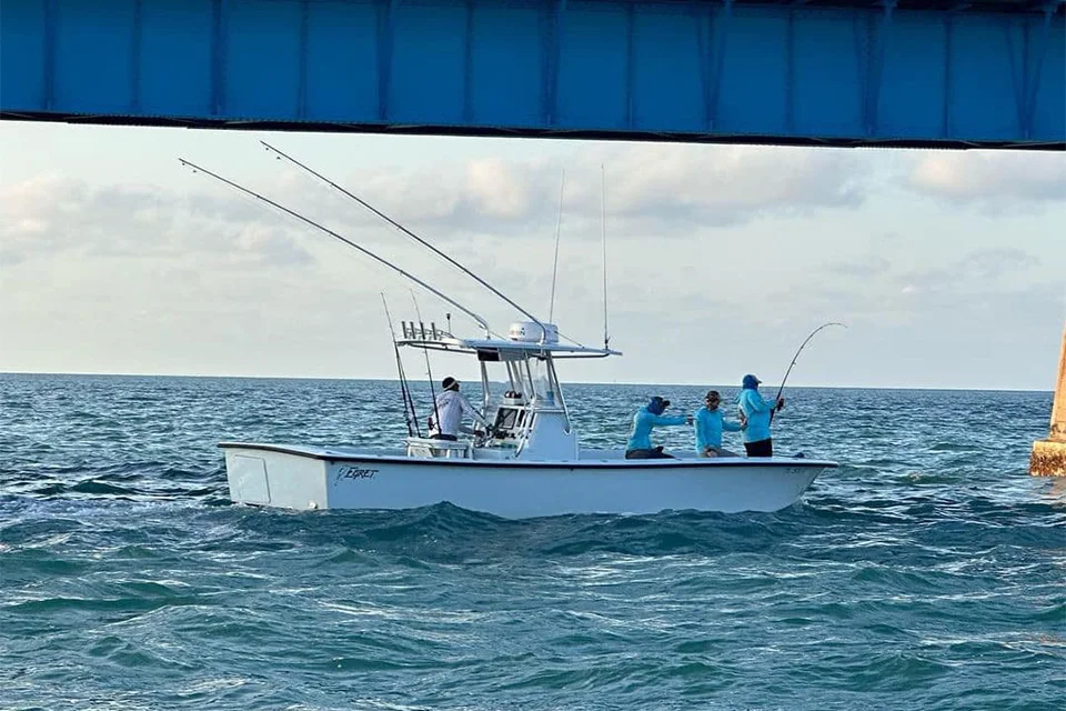 Tarpon trips run April through June, targeting the peak migration of these world-class sportfish. Fishing takes place around the Seven Mile Bridge, Bahia Honda State Park, Long Key Bridge, and nearby channels where tarpon gather to feed. Live mullet and pinfish are commonly used, freelined in the current to draw strikes. In addition to tarpon, anglers may also hook barracuda and shark.