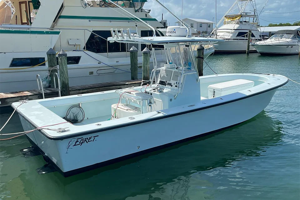 Fish the Florida Keys with Top Notch Sportfishing aboard a 31’ Egret center console powered by a Yanmar diesel engine and equipped with Garmin radar and electronics. The vessel features 360° fishing access, a shaded T-top, and space for up to six anglers.